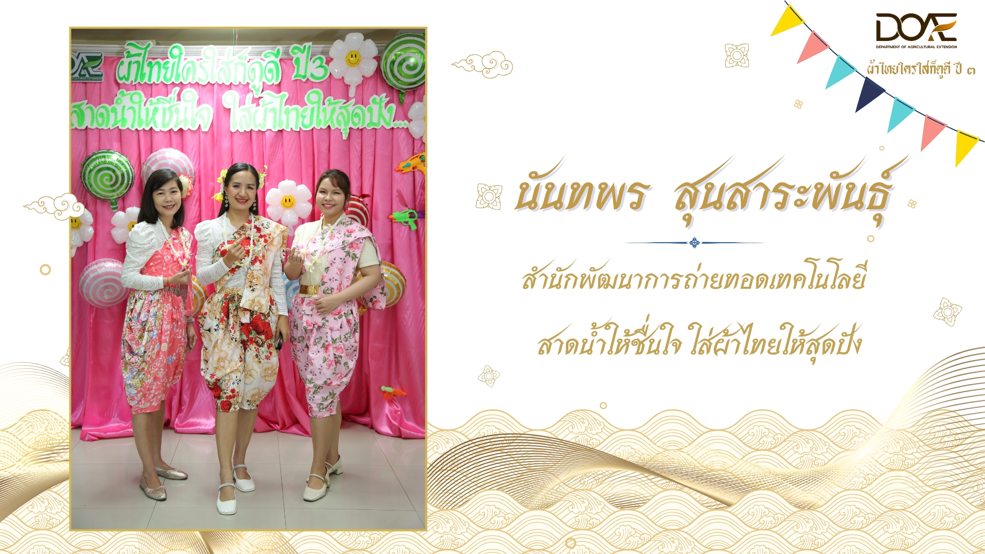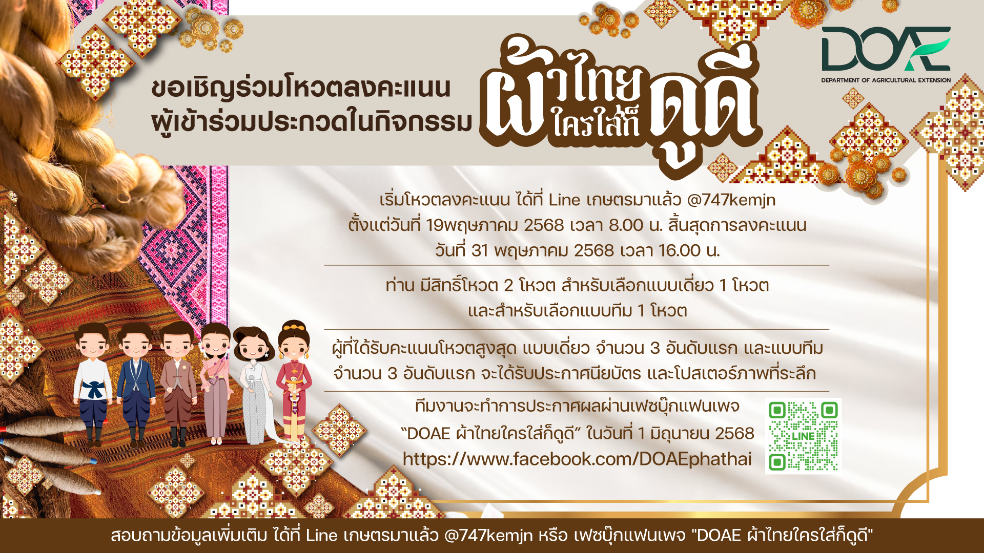 ขอเชิญพี่น้องชาวกรมส่งเสริมการเกษตรโหวตลงคะแนนผู้เข้าร่วมประกวดผ้าไทยในกิจกรรม “DOAE ผ้าไทยใครใส่ก็ดูดี ปี 3 ”